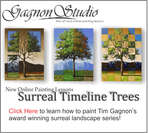 Offer 1: Learn how to paint Tim Gagnon's award winning Surreal Time Line Series. Order this set, and get an additional online lesson of your choice for free. Offer 2: $50 off Tim's popular Basic Landscape Fundamentals DVD set. Use coupon code: basic50 when checking out. Offer 3: Order any online lesson and get the DVD version shipped to you for free. (Use the contact form to request the DVD after purchase). |